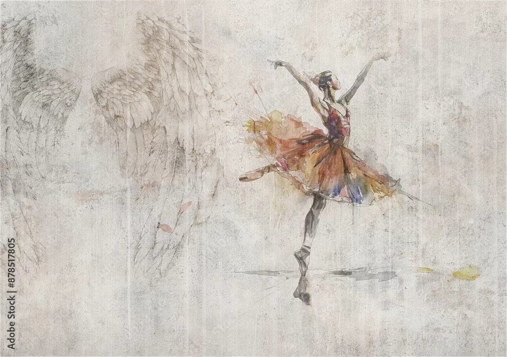 Fototapeta Ballerina. Wall with wings in the background. Illustration for wallpaper, poster, decoration.