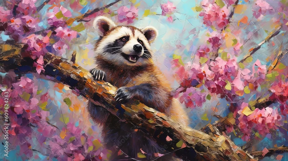 Fototapeta uroczy szop w atmosferze kwitnących kwiatów, Generatywna AI
