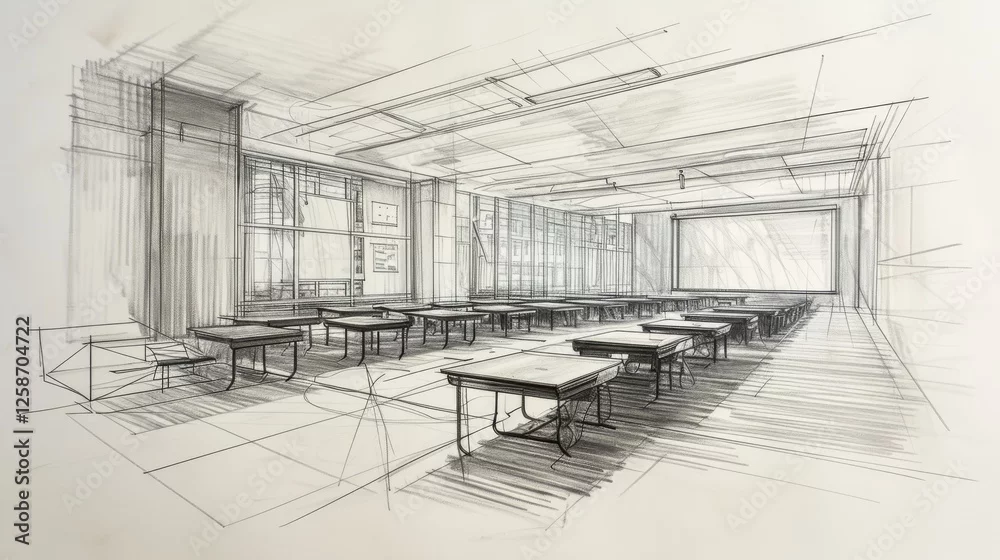 A hand-drawn pencil sketch depicting a spacious lecture hall with large windows, multiple desks, and a presentation screen. The drawing showcases architectural planning and perspective. AI generated.