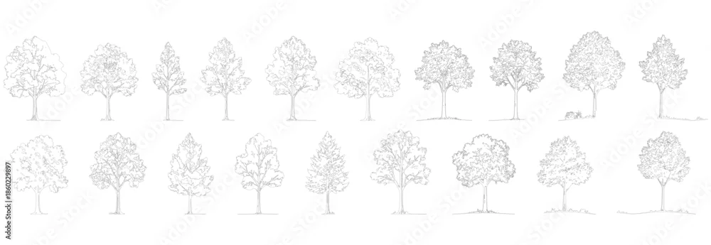 Fototapeta A large collection of 18 detailed black and white line art illustrations of various deciduous and coniferous trees, presented as silhouettes for architectural plan elevation and landscape design