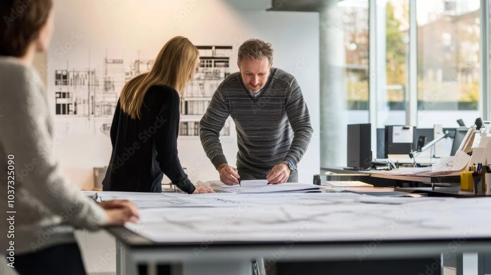 Fototapeta A modern architectural firm studio with architects discussing plans and sketches on a large drafting table, Architectural studio scene, Creative collaboration style