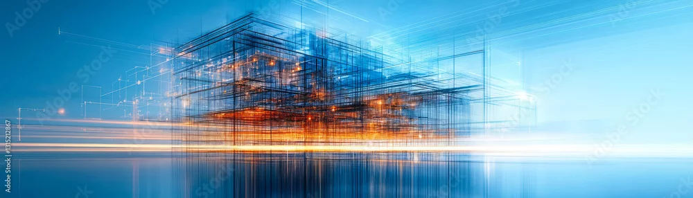 Fototapeta Abstract architectural design with futuristic industrial facility blueprint concept in vibrant digital rendering