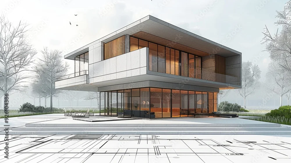 An architectural blueprint with line drawing of a modern house, White background, blueprints, white lines. The design includes the exterior wall in gray color and interior walls with glass windows.