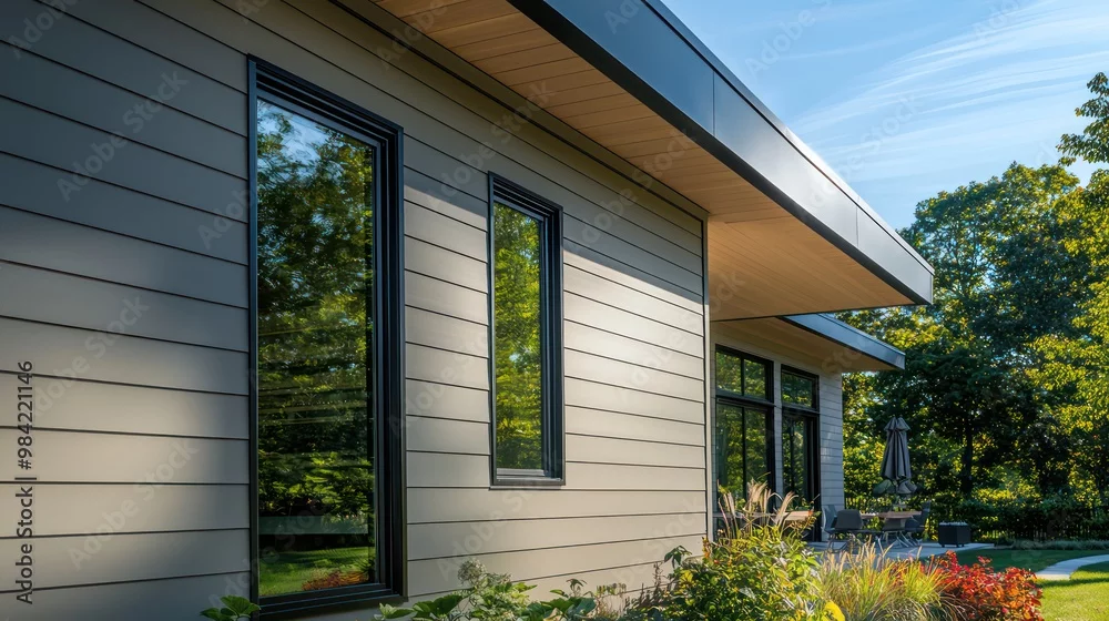 Fototapeta An architectural design studio with minimalist James Hardie siding, showcasing clean lines and a modern aesthetic, serving as both a workspace and a showcase of design principles