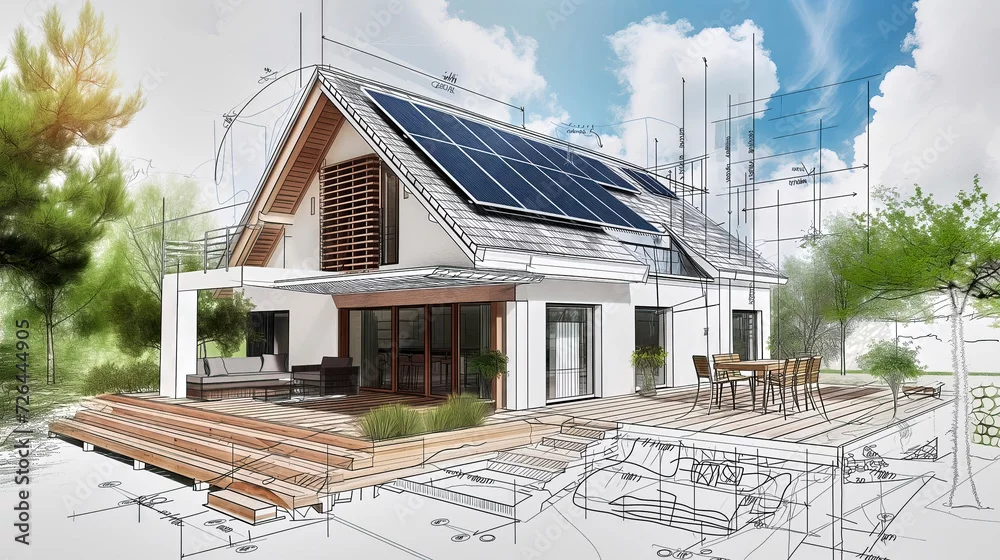 Fototapeta Architectural drawing for a single-family house with solar panels combined with a model photo of the house - do architekta - Picturewall.pl