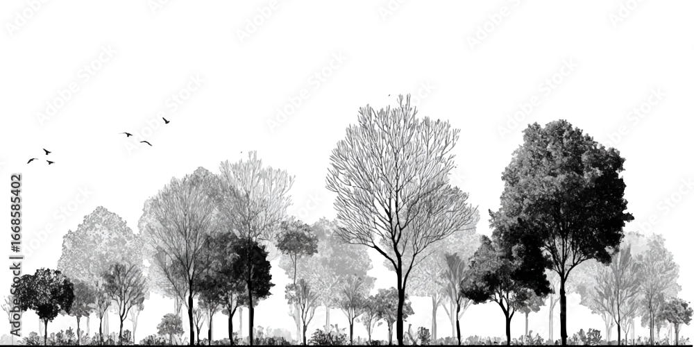 Fototapeta Architectural Drawings, Minimal style cad tree with roots line drawing and Tree Grunge vector, view, set of section wetland forest outline for landscape design drawing.