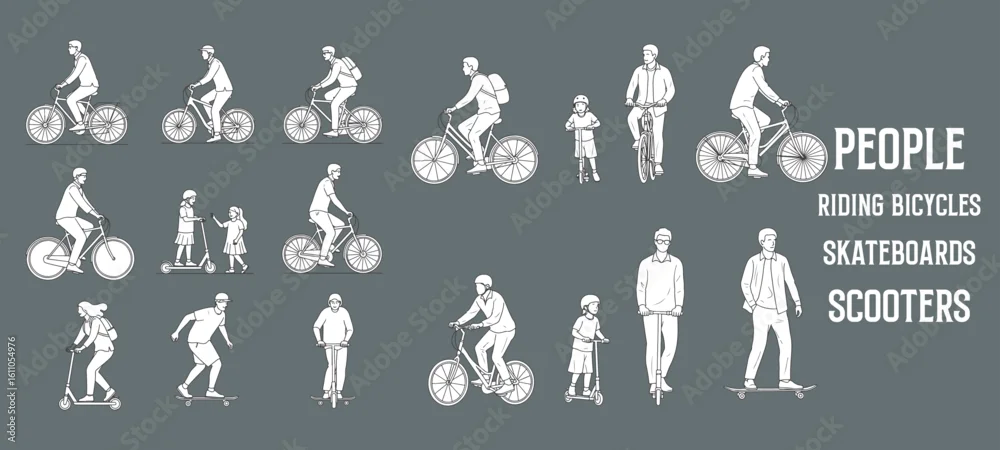 Architectural Drawings people riding bicycles, scooters, and skateboards vector illustration, side view, human person Minimal style hand drawn. Sections, Elevations, Floor Plans
