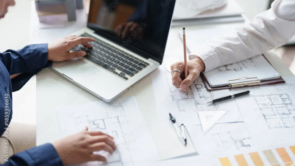 Architecture drawing on architectural project business architecture building construction Colleagues designer Planning Design on blueprint and compasses