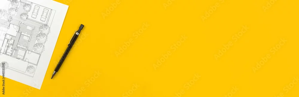 Banner construction and architect design concept. Residential building drawings and architectural blueprint on business desktop with pen. Yellow background and top view photo with copy space