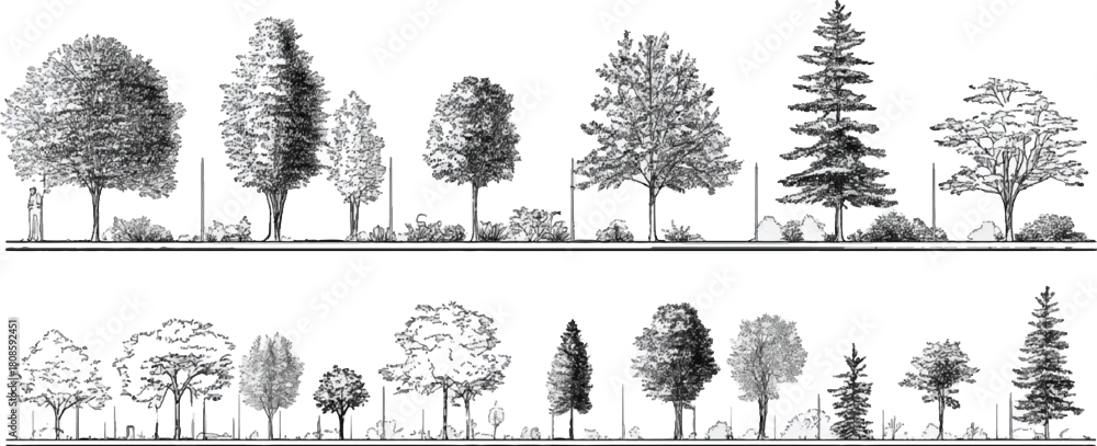 Fototapeta Black and white line drawing of various trees and shrubs in a row with a person for scale plant - do architekta - Picturewall.pl