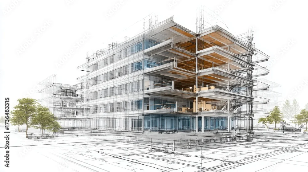 Building design evolving from a detailed architectural sketch blueprint to a visible modern structure and interior, illustrating the construction process and urban development