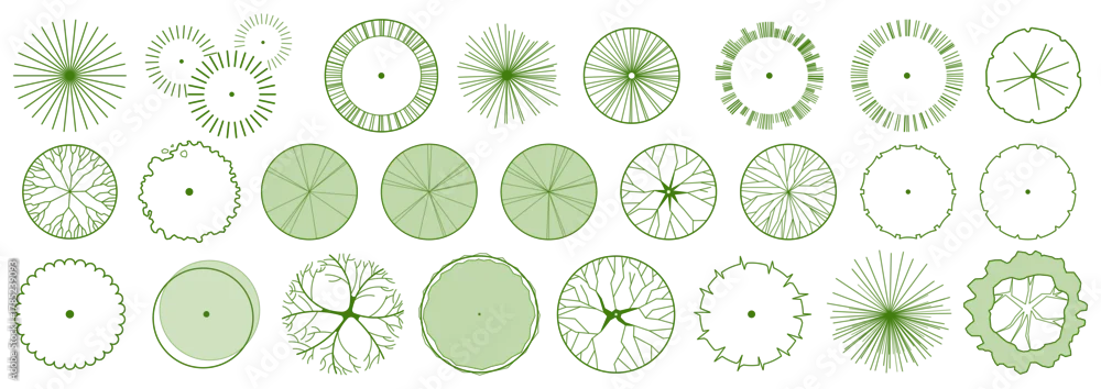 Fototapeta CAD project trees in top view, editable vector on white background, landscape design and architectural project, elements for environment and garden.
