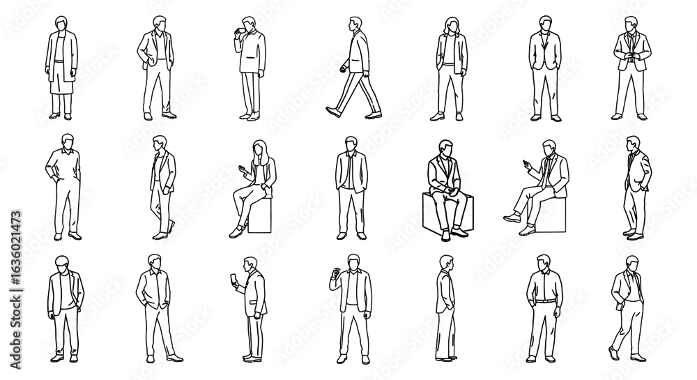 Diverse minimalist line art illustrations of people in various poses, perfect for architectural renderings, urban planning, and graphic design projects.