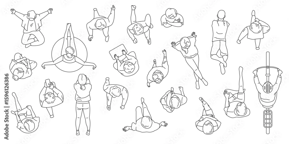 Line art illustration of various people seen from above. Monochrome design shows different poses and activities, perfect for architectural plans or creative layouts.