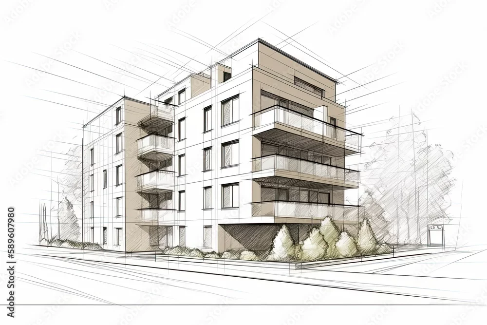 Fototapeta linear project of block of flats. Architectural concept sketch of modern apartments. Illustration Generative AI. - do architekta - Picturewall.pl