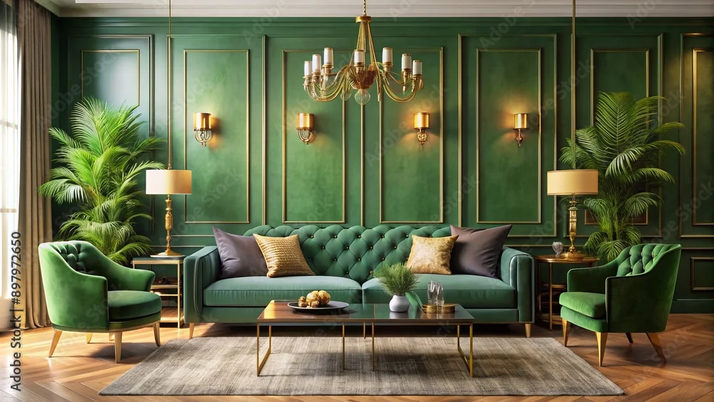 Luxurious green living room with sleek gold accents, velvet sofa, and vibrant wall decor, exuding modern sophistication and elegant harmony in a peaceful atmosphere.