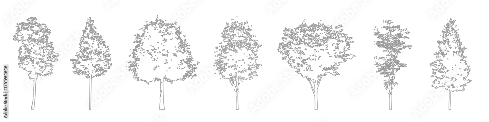 Fototapeta Minimal CAD tree drawings, side view outline trees for architectural and landscape plans