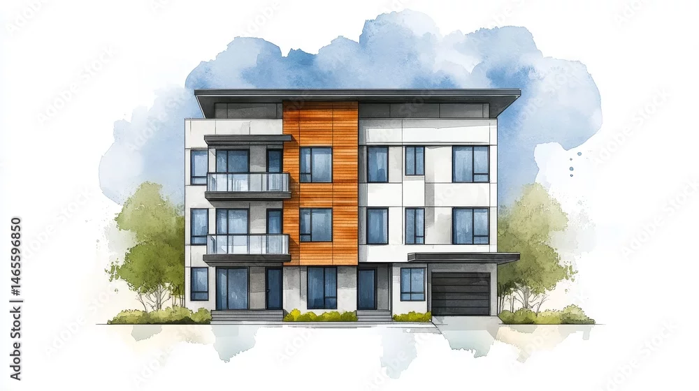 Fototapeta Modern Architectural Watercolor Design - Contemporary building, three-story, wood siding, balcony, garage, watercolor . Represents modern living, urban design, and sustainable architecture - do architekta - Picturewall.pl