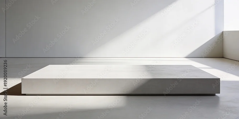 Fototapeta Modern concrete pedestal platform bathed in dramatic light and shadow, creating a stark minimalist aesthetic. Ideal for product placement, art displays, or architectural concepts. - do architekta - Picturewall.pl