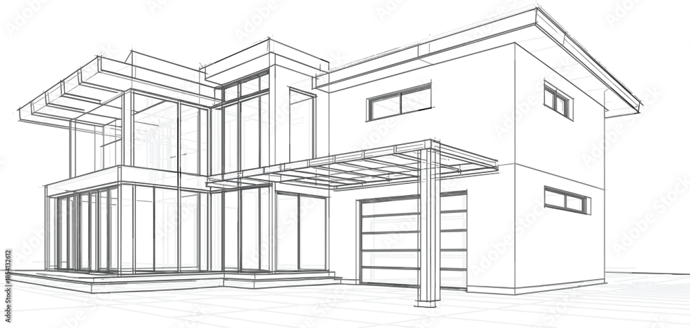 Fototapeta Modern luxury house architectural sketch with glass walls and garage, 3d wireframe building vector illustration design - do architekta - Picturewall.pl
