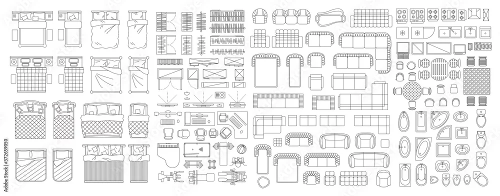 Set of linear icons. Interior top view. Furniture and elements for living room, bedroom, bathroom. Floor plan (view from above). Furniture store.