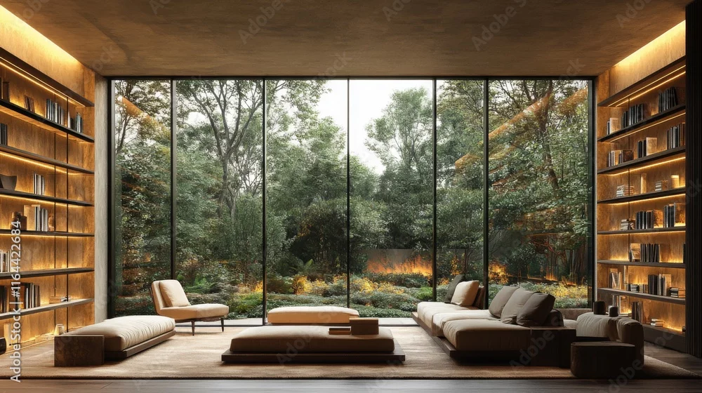 Spacious living room features a contemporary design with ample natural light pouring in from large windows. Cozy seating surrounds shelves filled with books, providing a relaxing atmosphere.