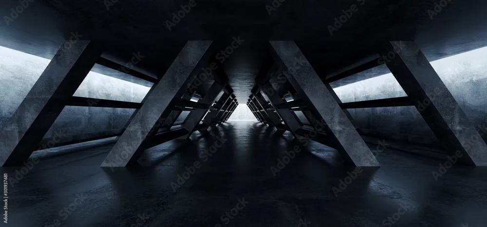 Fototapeta Trójkąt Betonowe kolumny cementowe Podziemny tunel Sci Fi Futurystyczny Ciemny korytarz Świecące białe światła LED Odbicia Garaż Rendering 3D