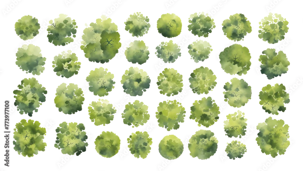 Fototapeta Various green trees, bushes and shrubs, top view for landscape design plan. Isolated watercolor illustration, PNG cutout.