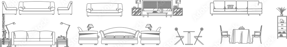 Fototapeta Vector line drawings of living and dining room furniture in front elevation, including sofas, tables, chairs, and lamps, for architectural sections.