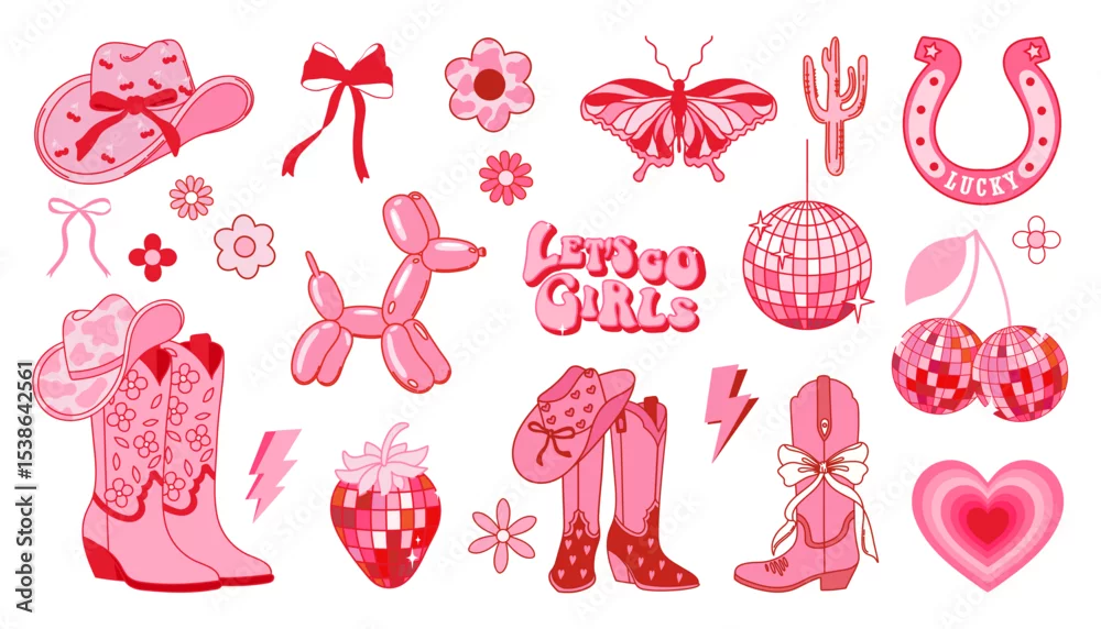 Collection of retro cowboy fashion elements. Cowgirl boots, disco ball, cherry, disco strawberry, hat, horseshoe, butterfly and lettering. Cowboy western and wild west theme. Hand drawn vector.