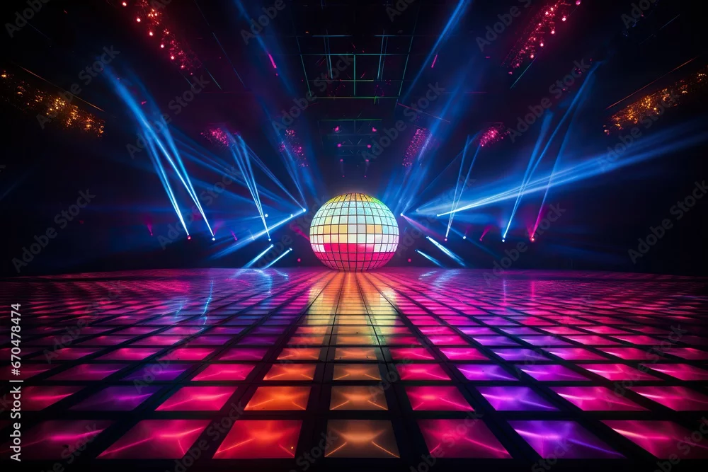 Fototapeta Colorful dance hall with a shimmering disco ball and beams of light.