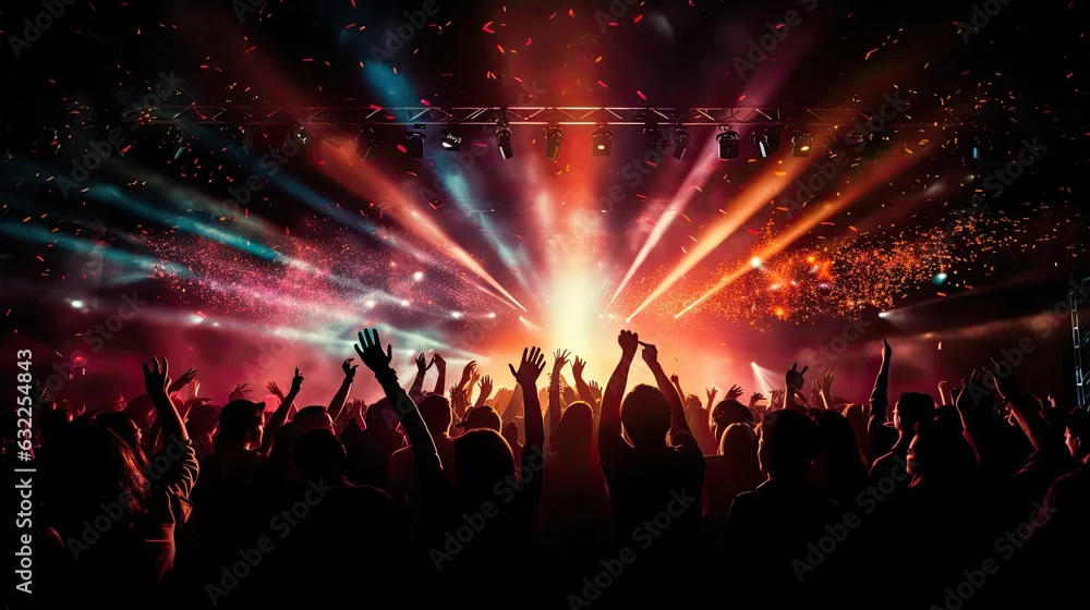 Fototapeta Concert crowd with colorful stage lights and confetti