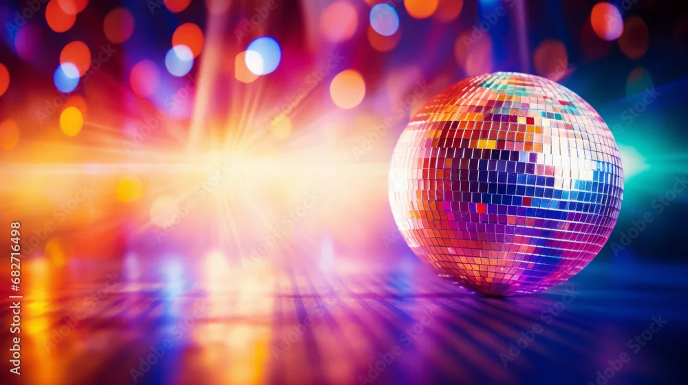 Fototapeta Disco ball sphere with colorful disco lights for party nights , wallpaper background with copy space