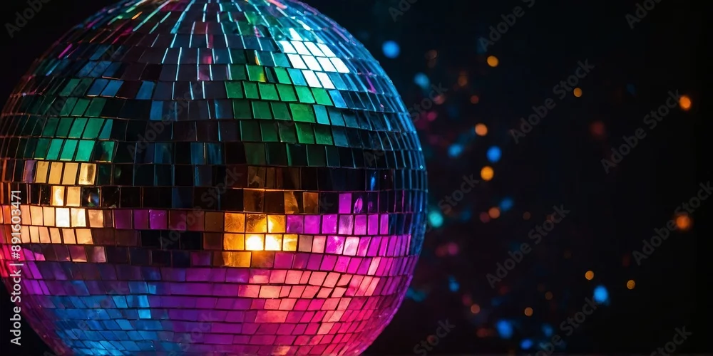 Fototapeta Disco ball sphere with colorful disco lights for party nights , wallpaper background with copy space.