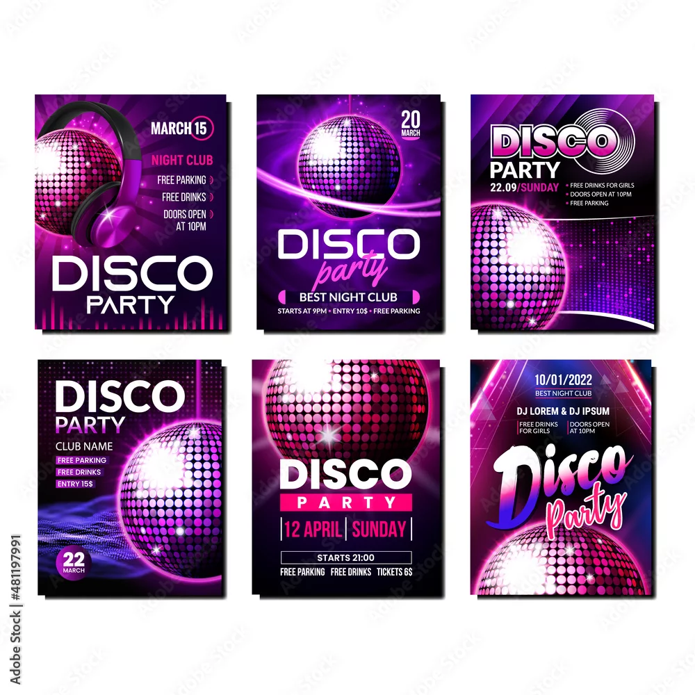 Disco music party poster background set Dance night. Abstract disco music club flyer. Event template. Dj retro party light. Neon banner. Show card. Fashion concert. Pink realistic vector illustration