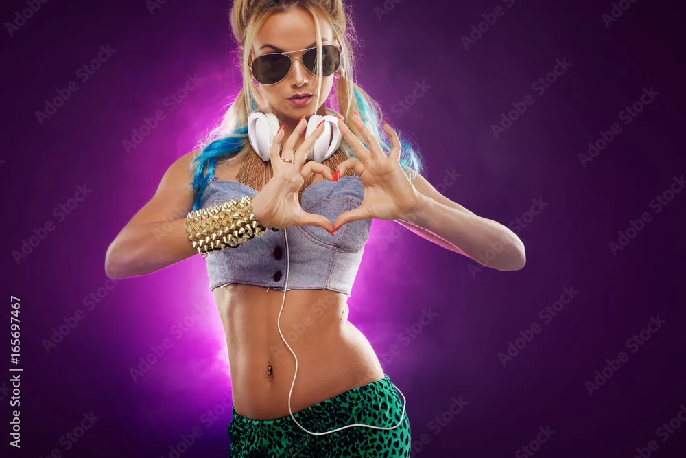 Fototapeta Dyskoteka dziewczyna pokazuje ręce znak serca. Styl retro - do dyskoteki - Picturewall.pl