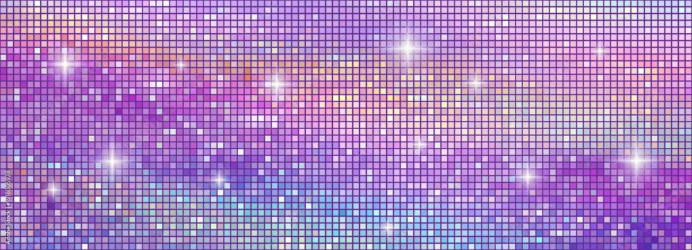 Fototapeta Mirror tiled disco globe sparkles with iridescent reflections. 3D dance sphere features blue color holographic textures perfect for retro club flyers and party banners