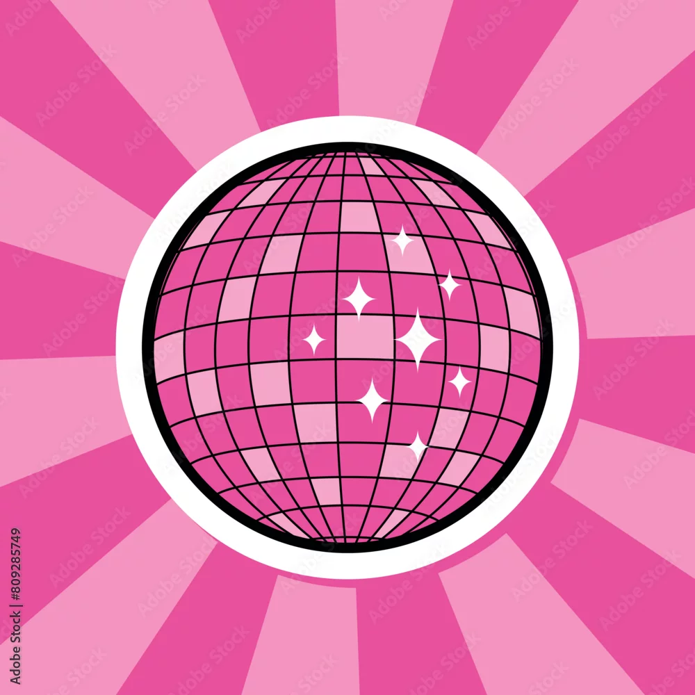 pink disco ball groovy sticker, cute round badge on groovy background, retro style vector illustration for disco party, retro music poster, parties, festivals, dance club