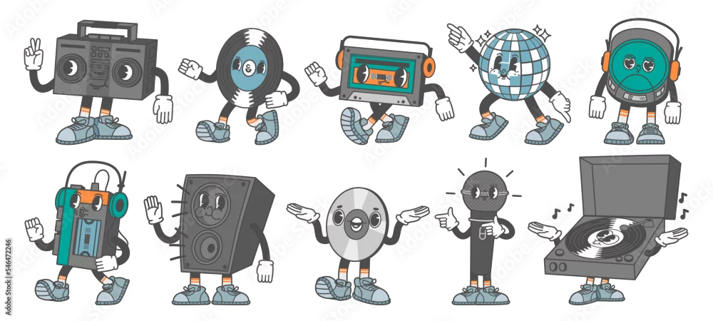 Retro music characters. Disco ball mascot, vinyl record, 80s cassette and CD. Turntable, tape and compact disk players. Analogue audio vector set