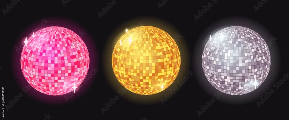 Fototapeta Set of colorful disco balls. Glowing glass spheres for retro party. Pink, gold and silver disco balls. Vector cartoon illustration - do dyskoteki - Picturewall.pl