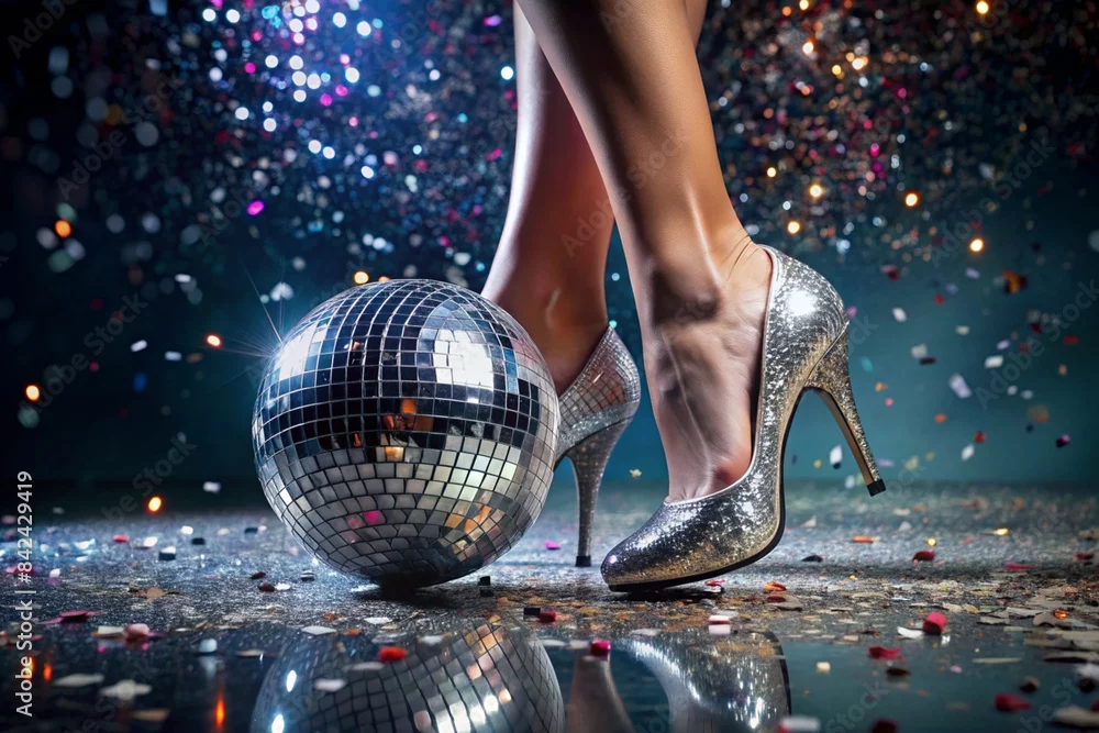 Women's legs in luxurious shiny pumps with heels at a party or disco on the background of a silver mirrored disco ball. The queen of the dance floor.