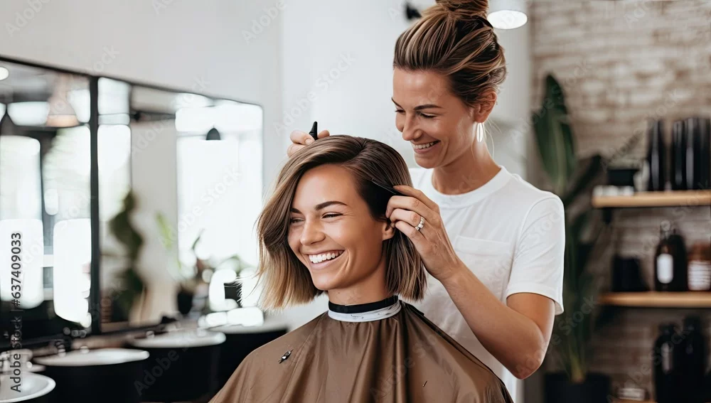 Fototapeta smiling hairdresser doing haircut for woman in beauty salon