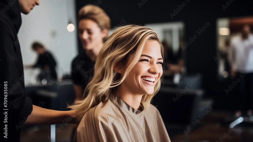 Beautiful young lady or woman with blonde hair at the hairdresser or hairstyling studio, female barber client, grooming saloon, youthful girl smiling, beautician profession treatment customer