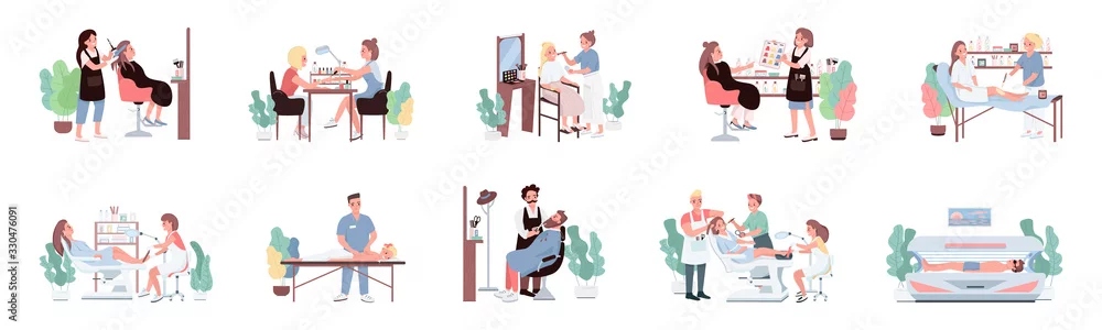 Beauty salon flat color vector characters set. Hairdresser with client. Beautician doing manicure. Make up artist. Cosmetic treatment procedures isolated cartoon illustrations on white background