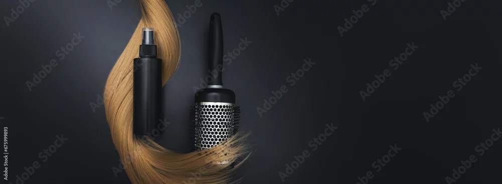 Fototapeta Blond shiny hair wave, Round brush for styling hair and Hair care spray, on black background. Hairdresser service, hair strength, haircut, hairstyle. Concept hairdresser spa salon. - do fryzjera - Picturewall.pl