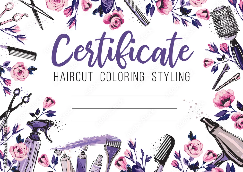 Hair cut and rose flower. Hairdressing business card, certificate or gift voucher, flyer. Beautiful illustration in watercolor style on white background