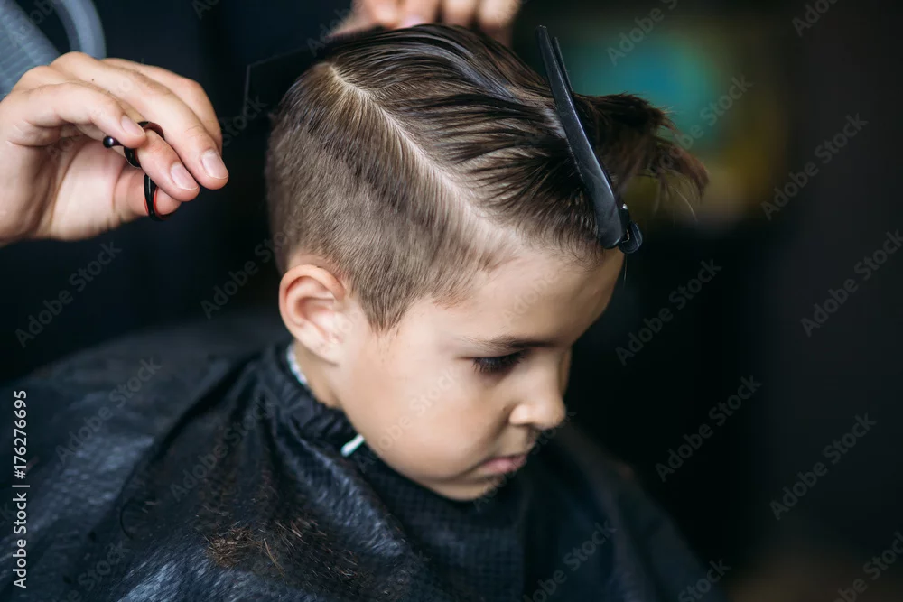 Fototapeta Mały chłopiec uzyskiwanie fryzury przez fryzjer, siedząc w fotelu w fryzjera.