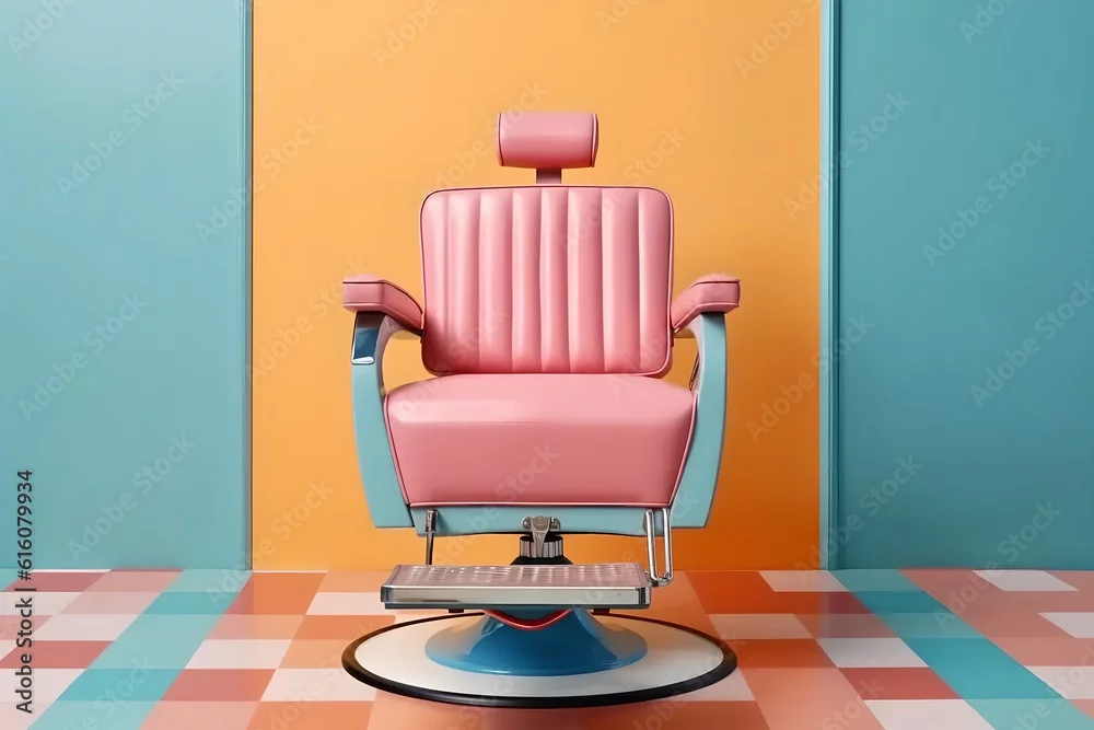 Fototapeta Modern armchair pop art hairdresser in a pastel barbershop interior. Generated AI. - do fryzjera - Picturewall.pl