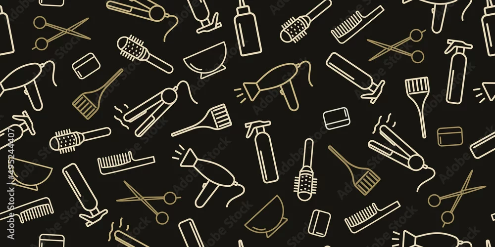 Professional equipment for hairdressing salon. Hair stylist tools horizontal seamless vector pattern. Linear icons haircut, hair coloring. Golden outline on a black background. For printing, banners