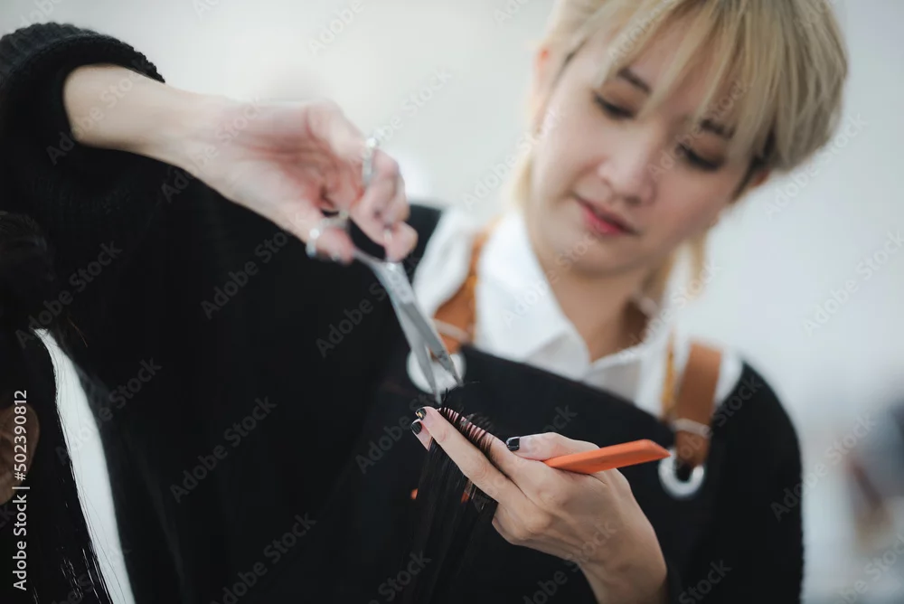 professional hairdresser person doing haircut for woman client in beauty fashion salon, hair care coiffure style concept, beautician female work with cut scissors to comb in barber, hairstylist tool